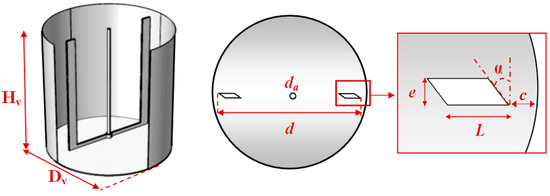 This study investigates a novel anchor impeller design with chamfered angles (α) of 22.5°, 45°, and 67.5°, comparing their performance to that of a classical anchor impeller with α = 0°, ensuring that the total surface area of the blades in contact with the fluid remains consistent across all configurations. The geometries of the stirring systems are depicted in Figure 1. The system consists of a cylindrical vessel with a flat bottom and no baffles, having a diameter Dv = 300 mm and a height Hv/Dv = 1. The impellers, each with a diameter of d = 288 mm, are mounted on a shaft with a diameter ratio da/Dv = 0.023. The blades feature a length ratio L/Dv = 0.067 and a thickness of e/Dv = 0.027, with geometrical parameters detailed in Table 1.