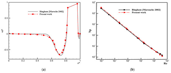 To validate the accuracy of our numerical simulation, we compared our results with those documented by Marouche et al. [34], who performed numerical simulations under identical rheological and geometrical conditions. These parameters involved a standard anchor impeller and a Bingham fluid characterized by a viscosity of μ = 0.1 Pa·s and a yield stress of = 1 Pa. We assessed the tangential velocity profile at the impeller plane and the power number across various Reynolds numbers. The findings, illustrated in Figure 3, demonstrate a strong agreement between our computed results and those of Marouche et al. [31]. Additionally, in Figure 4, we compare our results with experimental data from Anne-Archard et al. [35] for a Newtonian fluid, where = 0 Pa in our model. The agreement between the numerical and experimental results further reinforces the accuracy of our model in capturing the behavior of both Bingham and Newtonian fluids.