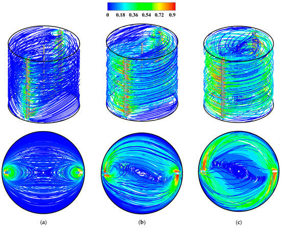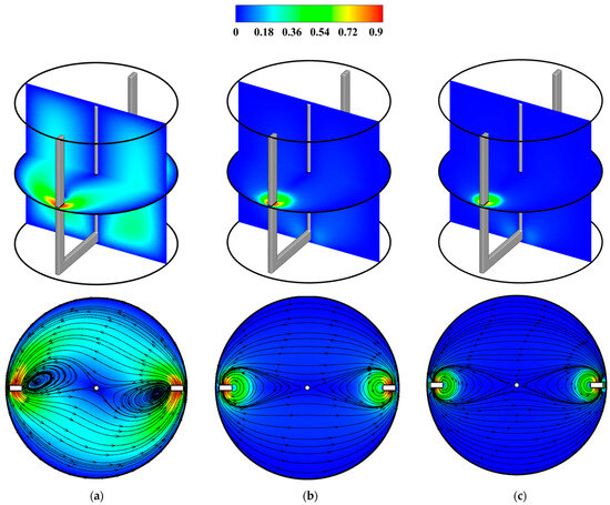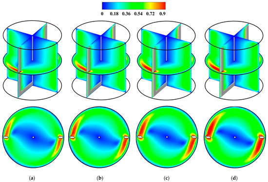 In contrast, at Re = 415 (Figure 8), fluid circulation improves significantly across all configurations. The higher Reynolds number increases fluid velocities, enhancing mixing. The chamfered impeller with a 67.5° angle exhibits the most extensive region of active fluid motion, suggesting superior pumping and circulation efficiency. Larger chamfered angles promote better flow patterns around the blades, making them more effective at enhancing circulation under high Reynolds number conditions. Optimizing the chamfered angle is thus crucial for improving mixing performance.