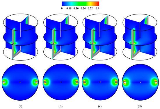 Effect of blade chamfered angles on the velocity magnitude contour: (a) ; (b) ; (c) ; (d) for Re = 415 and .