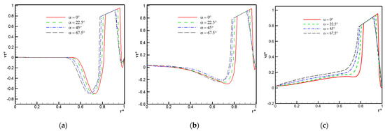 Effect of blade chamfered angles on tangential velocity profiles along the median line for different Reynolds numbers: (a) Re = 13.8; (b) Re = 140; (c) Re = 415 for .