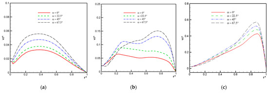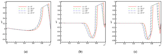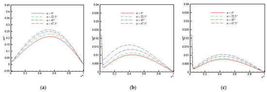 In Figure 9, at a lower Reynolds number of Re = 13.8, the velocity profiles reveal that fluid movement is concentrated primarily near the impeller blades, where it peaks at the tips of the blades and gradually diminishes to zero along the walls of the vessel. The profile for the 0° angle shows the least fluid movement, with negative velocities observed close to the blades, indicating poor mixing efficiency. As the chamfered angle increases, there is a slight enhancement in fluid movement near the blades, with progressively higher velocities recorded at a radial position of r* = 0.7. However, despite this slight improvement, the overall circulation remains weak, and a significant stagnant region is evident at the center of the vessel.