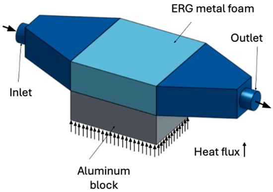 Figure 3, an aluminum block is heated by applying a heat flux at the bottom of the block. At the top surface of the block, the ERG metal foam is located, and a thermal paste between the metal foam and the aluminum block is applied to provide good contact between the two structures. The flow enters from the inlet shown in