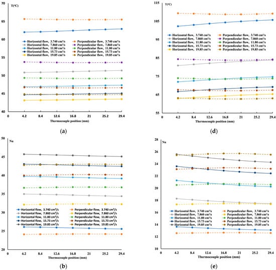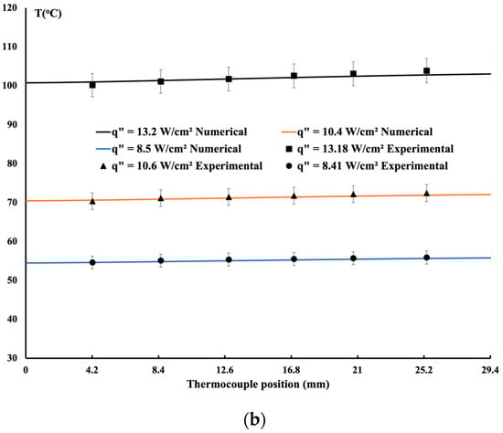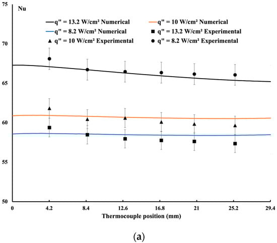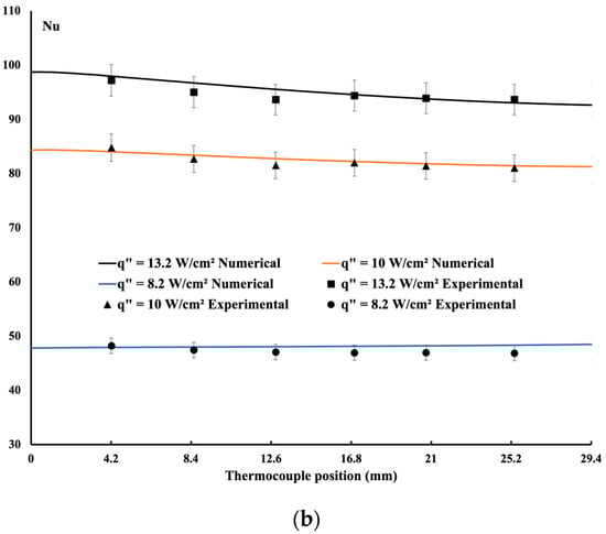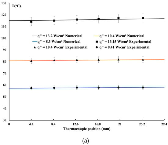 Figure 4a, temperature distribution increases due to the cooling process. At the inlet, the fluid is maintained at an inlet temperature of Tin; as the flow progresses, its temperature increases; thus, towards the end, less heat is removed from the hot surface. As the heat flux increases, it is easy to observe a rise in the temperature. In general, as shown, good agreement is obtained between the measured and calculated methods.
