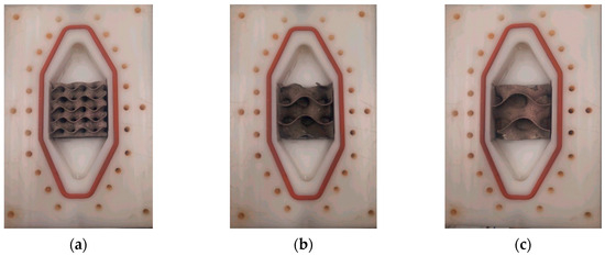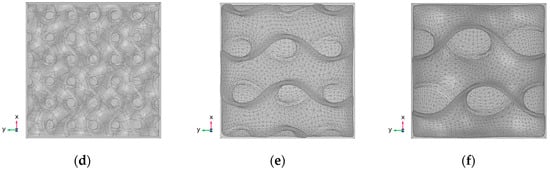 29]. Amongst these, one can design the type of structure and the porosity based on the required application. For instance, a gyroid TPMS has proven useful in heat exchangers and heat removal. In contrast, another family of triply periodic minimal surfaces known as Fisher–Koch S (FKS) structures are necessary for biomedical applications. Thus, three gyroid structures are used in the current study. The difference between them is the porosity, which is 0.7, 0.8, and 0.9, respectively. These structures have different surface areas of 8.4 × 10