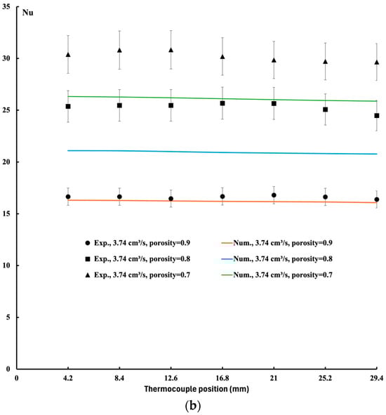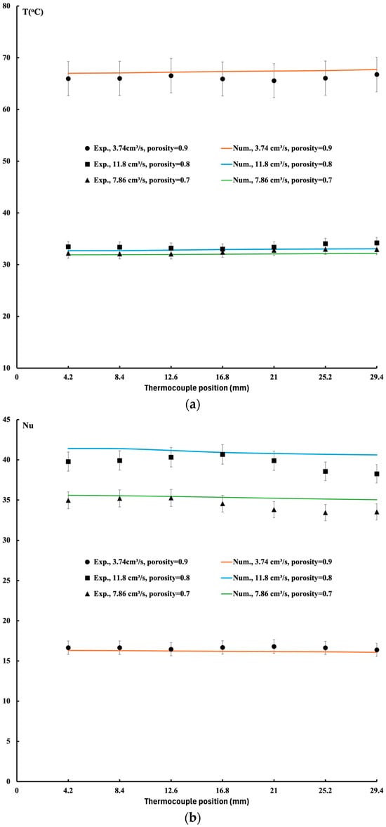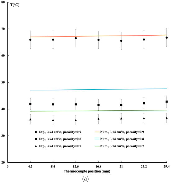 3/s. Contrary to the metal foam, a uniform temperature distribution is observed. Good agreement between the experimental data and numerical models is observed. The difference between the two approaches is due to some heat loss from the experimental setup, which led to lower temperatures in some cases.