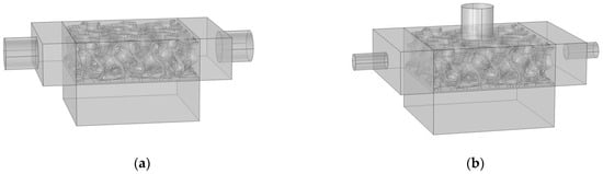Figure 10a. It is identical to the model used in the experimental setup. Within the parallel flow, two different porous structures are used. The first is a metal foam with a porosity of 0.91, like the one used in the experimental setup. In the second case, a TPMS structure (similar to the one used in the experiment) is inserted to replace the metal foam, as shown in