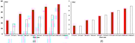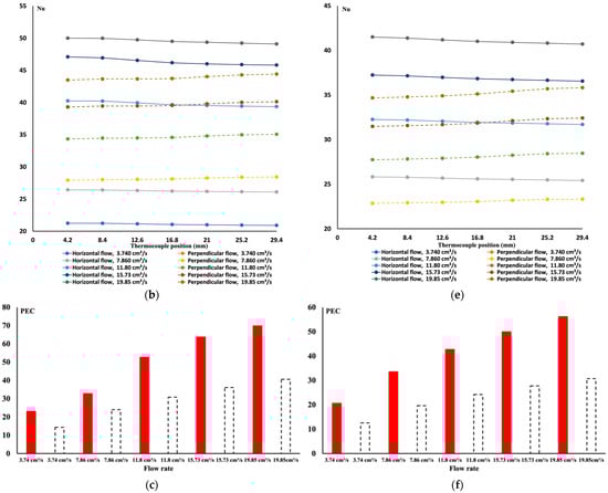 Figure 11c,f. The data in the red column are for the parallel flow case, and the data in the dotted column are for the perpendicular flow case. It is observed that when the flow is parallel, less pressure drop is attained, and more heat extraction is achieved. Thus, from this finding one can argue that the best cooling is when the flow is parallel to the heated surface. The flow can extract heat from the structure itself and the hot surface. The performance of the TPMS structure is more pronounced since there is no significant buildup of the boundary layer.