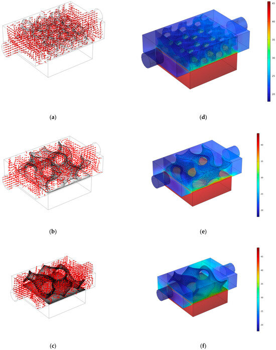 Figure 13d shows the volume temperature distribution in the gyroid. The gyroid structure temperature is very low, indicating that the flow removed heat from this structure. Higher temperatures are observed at the structure’s base and in the aluminum block.