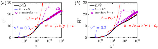 Figure 2. An illustration of the law of the wall for the variation of mean streamwise velocity (a) and mean temperature (b) with different y + values chosen for turbulence models for low-Reynolds-number models and high-Reynolds-number models at R e τ = 180 and P r = 0.71 .