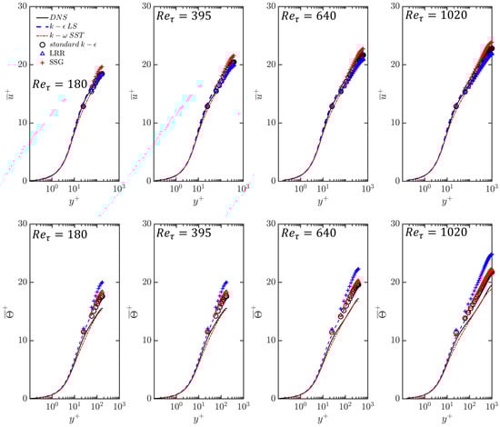 The velocity statistics in this configuration are expected to exhibit self-similarity, which is independent of the Reynolds number. It has indeed been found that the mean behaviour of the streamwise velocity and temperature remains unchanged despite variations in R e τ . This can be substantiated by Figure 4, where self-similarity is demonstrated by the variations of the mean profiles of the streamwise velocity and temperature obtained from both DNS and turbulence model predictions.
