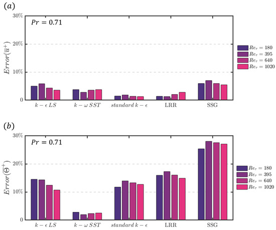 Figure 5. Error estimation of mean velocity (a) and temperature (b) of different turbulence models at P r = 0.71 with different R e τ .