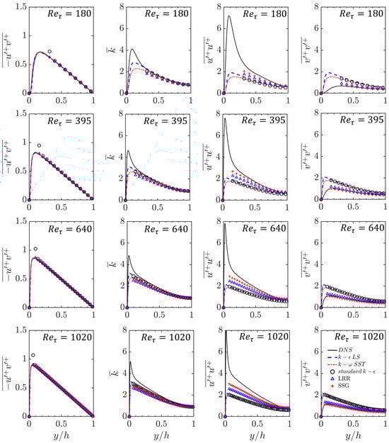 Figure 6. The profiles of the Reynolds shear stress, turbulent kinetic energy, Reynolds normal stress in the direction parallel to the wall, and normal stress in the wall-normal direction at P r = 0.71 with different R e τ .