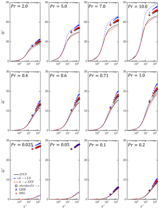 Figure 7. A comparison of mean non-dimensional temperature profiles obtained from RANS models with DNS data at R e τ = 180 for different Prandtl numbers.