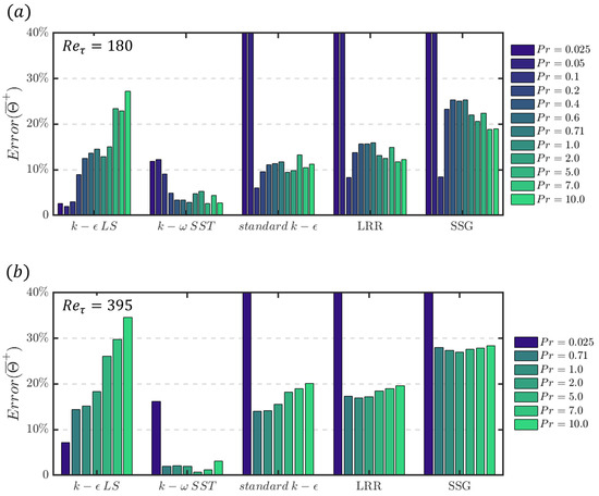 Figure 8. Error estimation of the mean temperature of different turbulence models with different P r at R e τ = (a) 180 and (b) 395.