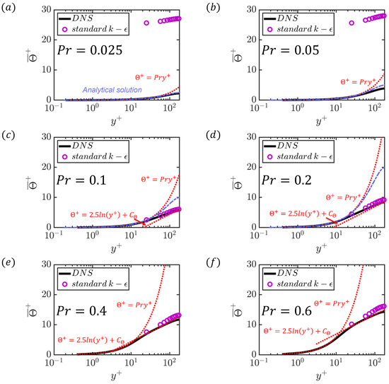 The transitional regime can be observed at P r = 0.1 and 0.2 in Figure 10c,d, respectively, where a diffusion sublayer and an intermediate layer exist. The DNS results aligned well with the analytical solution only in the diffusion sublayer, while deviations are seen in the intermediate layer, indicating that turbulent diffusivity effects became important. There is no log-law layer observed because the slope of the DNS data and the standard k ϵ model deviate from the log-law layer auxiliary line ( Θ ¯ + = 2.5 l n ( y + ) + C Θ ). However, as P r increases, the mean temperature profiles of DNS and the standard k ϵ in the log-law layer gradually approached the log-law layer’s auxiliary line.