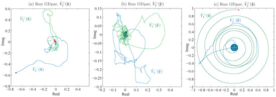 Here, and , and are the normalized inverse temperatures related to inverse temperatures appearing in the phase space probability density (44); please see Section 4 for details. Table 3, Table 4 and Table 5 list the average values of E, , and , during a run; using these, as needed in (71) for the ideal values , , and , the normalized inverse temperatures , and are determined by numerically finding the minimum of the entropy functional (71) using a bisection method [76] with the proviso that, for Case II runs, ; for Case III runs, ; for Case IV runs, ; and for Case V runs, . The values of , , and for the runs in Table 3, Table 4 and Table 5 are given in Table 6.