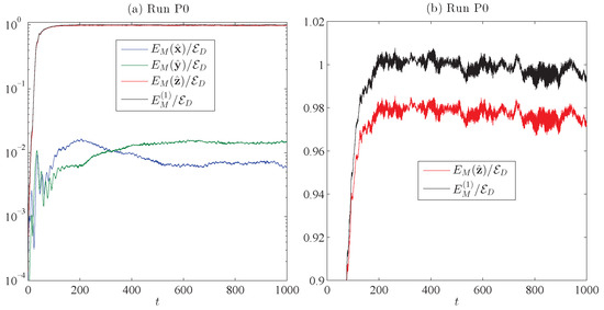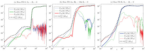 Using (32), the volume-averaged energy E, enstrophy , mean-squared current J, cross helicity , magnetic helicity , and mean-squared vector potential A (the last two defined in terms of the magnetic vector potential , where , ) are