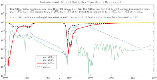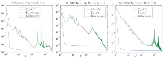 In Figure 8, equilibrium magnetic energy spectra for forced, dissipative Runs (a) GD2 and (b) GD6 of Table 4, along with (c) forced, dissipative, parallel helicity Run GDpar of Table 5 are presented, along with associated ideal prediction (158) and the Kolmogorov prediction. The associated ideal spectra are, again, found using Table 4 average values: , and for GD2; and for GD6; and and for GDpar. The forcing wave number was for GD2 and GD6, while it was for GDpar. The correlation of ‘inertial range’ spectra with the Kolmogorov prediction for spectra integrated over wave number; for the spectra shown in Figure 8, what is plotted is the averaged value at each , for which the Kolmogorov prediction becomes . The results shown in Figure 8 are consistent with what we find in all the forced, dissipative runs we have carried out, so they appear robust and indicate that an inertial range has been resolved in these numerical simulations of real MHD turbulence.
