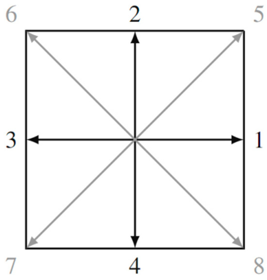 For the D2Q9 model, the interpretation of which is shown in Figure 2, it is characteristic that the discrete velocities are given by the expressions: