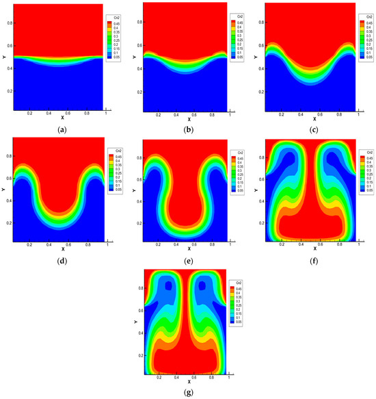 Figure 3 shows the isoconcentration lines of carbon dioxide at different mixing times of the ternary gas system 0.50 He (1) + 0.50 CO2 (2) − N2 (3) at pressure p = 1.0 MPa and T = 298.0 K. At t = 0 s, the density of the binary mixture located in the upper part of the diffusion channel is less than the density of nitrogen, which is localized in the lower part. Diffusion takes place at the initial stage (see Figure 3a). After 0.33 s, a violation of the monotonicity in the distribution of isoconcentration lines, which increases with time (Figure 3b,c), is recorded. Such a distribution is not characteristic of diffusion mixing. It can be assumed that, starting from this time, instability in the mechanical equilibrium, which is the cause of the appearance of convection, arises in the system under study. Figure 3d shows the development of a convective cell, which begins 0.95 s after the start of mixing. At the final stage (Figure 3e–g), the convective formation begins to move in the gravity field relative to the diffusion interface. Then, but already under other initial condition, the process of structural formation begins again, but, already under other boundary conditions, i.e., in the system under study, the appearance of a drop convective mixing mode, which was recorded experimentally in various ternary mixtures [17,18,22], including those containing CO2 [23], is possible.