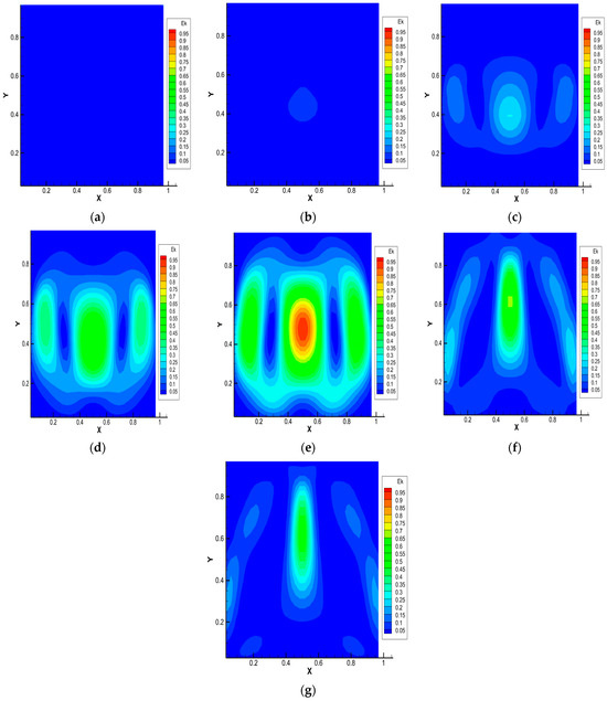 Figure 4 shows the pressure distributions under thermophysical conditions and characteristic mixing times corresponding to Figure 3. It is noteworthy that the largest pressure perturbations occur at times corresponding to the formation of a convective cell (Figure 4d,e). Further complex pressure fluctuations (Figure 4e–g) show the presence of zones of increased and decreased pressure in the system caused by the presence of complex convective formations.