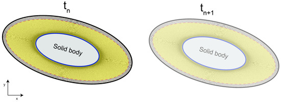 Most of these steps have already been discussed in detail in [1]. The primary distinction lies in the fact that the Eulerian mesh is now in motion. Therefore, before calculating the Eulerian boundary conditions, the Eulerian solver updates its mesh using the prescribed motion specified by the user. It is important to emphasize that Fluid–Structure Interaction (FSI) is not addressed in this context, and special modifications are required in the code to account for such scenarios. Here, the mesh undergoes motion solely based on predefined motion patterns. The mesh is in motion, and consequently the interpolation region moves as well, as illustrated in Figure 3.