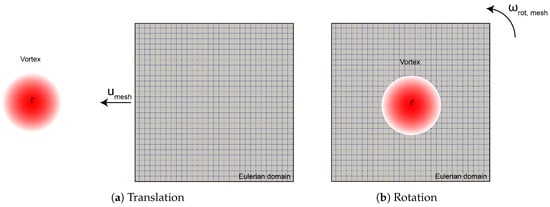 The various cases chosen for validation, as depicted in Figure 6, encompass translational motion, rotational motion, linear oscillation, and multi-motion, which combines linear oscillation and rotation. In each of these cases, a stationary Lamb–Oseen vortex [29] is present within the flow. The Eulerian domain is in relative motion to the vortex, following the specified motion patterns. The Lamb–Oseen vortex is characterized by analytical solutions outlined in the following equations: