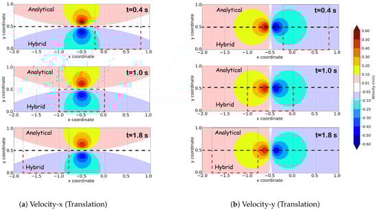Comparison of the velocity field between the analytical (top) and hybrid (bottom) solutions for the translational case. The x-component of velocity is depicted on the left, while the y-component is shown on the right. The analytical and hybrid solutions are separated by a black dashed line [---] and the Eulerian domain at the corresponding time instance is defined by a red rectangle,