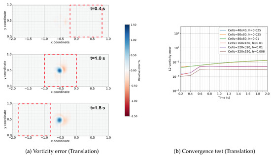 On the left, the relative error of the vorticity field between the hybrid and the analytical solution for the translational case is illustrated. The Eulerian domain at the corresponding time instance is defined by a red rectangle,
