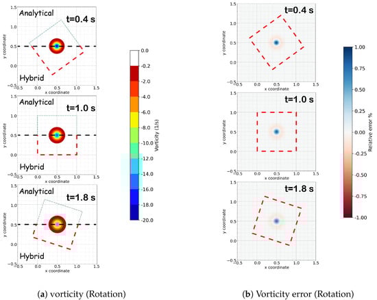 The second validation case involves the pure rotation of the Eulerian domain, as depicted in Figure 6b. This time, the vortex is situated within the Eulerian domain, and the domain initiates a rotational motion around its center, coinciding with the center of the vortex’s core. In this and subsequent cases, only the vorticity field and the associated error are presented. Figure 9b illustrates a noteworthy agreement in the vorticity field between analytical and hybrid solutions. Specifically, the maximum errors are constrained to , and this error is present from the beginning of the simulation due to discretization. As the vortex neither enters nor exits the Eulerian domain in this case, no additional errors are introduced.