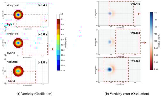 In the last validation case, the Eulerian mesh performs a more complex motion pattern. Specifically, the vortex is initially located at the center of the Eulerian mesh, and this starts a combined linear oscillation in the x axis and a rotation around point . This combined motion causes the Eulerian domain to pass through the vortex twice. Figure 11 shows a great agreement of the vorticity field between the hybrid and analytical solutions, while the vorticity error presented in Figure 11b is always lower than . An initial error around is present since the start of the simulation, and it grows to when the Eulerian mesh passes through the vortex for the second time.