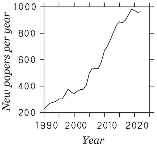 Figure 1 illustrates the steadily growing interest in these questions with about 1000 journal publications per year right now. The development of views over 80 years [14,15,16,17,18,19,20,21,22,23,24,25,26,27,28,29,30,31,32,33,34,35,36,37,38,39,40,41] were reviewed, for example, by Örlü et al. [42], Marusic et al. [43], Smits et al. [44], and Jiménez [45]. The Princeton superpipe (PSP) measurements (involving data up to 530,023) were available at this time [46], but concerns about the data accuracy still exist [47]. Supported by increasing access to high data, the controversial debate of the validity and universality of the law of the wall vibrantly continuous over the last 15 years: traditional views in favor of universality are challenged by opposite views [48,49,50,51,52,53,54,55,56,57,58,59,60,61,62,63,64,65]. Recent analyses in favor of universality were presented, e.g., in Refs. [56,66,67,68,69,70]. In particular, a comprehensive analysis of available numerical and experimental data up to very high was presented recently based on observational physics criteria [9,10]. The latter results were recently questioned by data analyses of the majority of existing DNS and experimental results, arguing in favor of nonuniversality of the law of the wall [47,57,71,72,73].