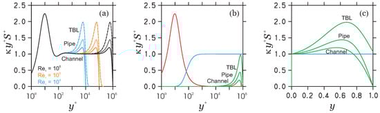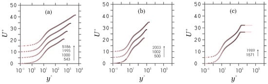 The PVM (lines) compared to DNS data (dots) for the given (separated by ). (a) Channel flow; DNS data of Lee & Moser [75,76]. (b) pipe flow; DNS data of Chin et al. [77]. (c) TBL; DNS data of Sillero et al. [78,79].