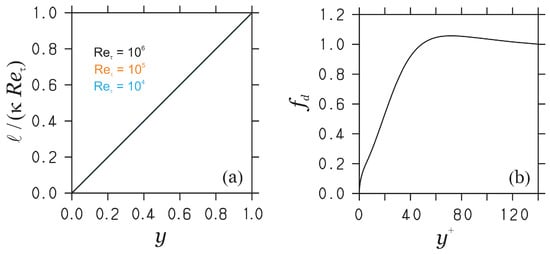Hence, the length scale ℓ fully determines the flow-independent inner scaling structure of the velocity field. The exact Equation (1) corresponds to an interpolation of limit cases of for , respectively. For sufficiently large , Equation (1) implies the log-law because of . Via , it is worth noting that the von Kármán constant is the essential ingredient of inner scaling velocity variations.