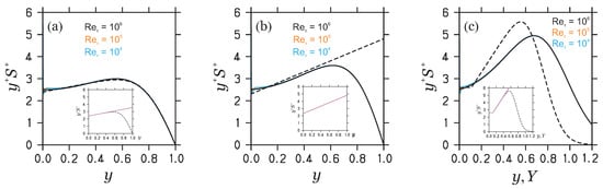 Normalized turbulent viscosity (a) and turbulence production (b) predictions: pipe flow DNS data [77] (black lines), Cantwell model results [47] (dashed green lines, ), and PVM results. PVM predictions for are shown by magenta, cyan, and orange lines. The inset in (b) shows production peak positions according to Cantwell’s model for the given . (c) shows the entropy according to Cantwell’s model for the given .
