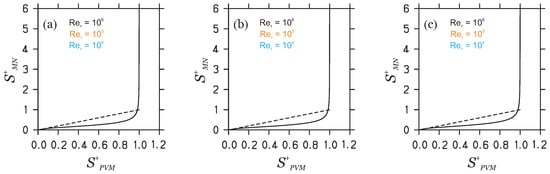 Figure 8. The correlation of obtained by the PVM () and MN () is shown for the given for (a) channel flow, (b) pipe flow, and (c) TBL. There is no visible effect. The dashed lines show the expected 1:1 relationships.