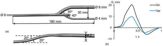 For the developed proximal anastomosis model, the following dimensions were adopted: the internal diameters of the CFA, deep femoral artery, and graft are 6, 4, and 8 mm, respectively. The angle of the graft branch from the CFA is 50°, and from the DFA is 40°. The length of the inlet straight section of the femoral artery before the graft branch is 10 mm, and the total length of the model is 110 mm. The axes of the straight outlet sections of the graft and the deep femoral artery are spaced 30 mm from each other. To reduce the influence of uncertainties in setting inlet conditions for velocity, the proximal anastomosis model was supplemented with an inlet section (supply tube) with a length of 70 mm, modeling a moderate double bend of the femoral artery in a plane normal to the plane of symmetry of the anastomosis. A general displacement of the central line of this inlet section is 15 mm (Figure 1a). The model with a wall thickness of 1 mm was made by 3D printing using Tough 20003D plastic (Formlabs Co., Somerville, MS, USA).