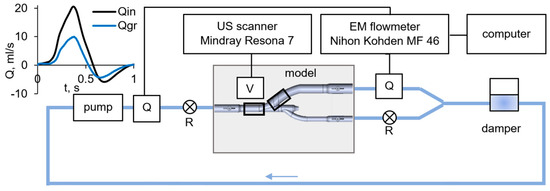 The measuring system consisted of a Nihon Kohden MF-46 electromagnetic flow meter (Nihon Kohden Corp., Tokyo, Japan) connected via an ADC to the computer, and a Mindray Resona 7 ultrasonic scanner (Shenzhen Mindray Bio-Medical Electronics Co., Ltd., Shenzhen, China), with a linear transducer installed above the model under study (Figure 2). The flow meter was equipped with two flow transducers, positioned before the model inlet and behind the graft outlet to measure flow rates Qin(t) and Qgr(t), correspondingly.