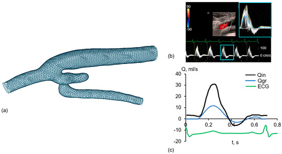 Changes in the average flow rate over time were specified as boundary conditions at the inlet to the computational domain corresponding to the CFA, section Sin, and at one of the outlets corresponding to the graft, section Sgr. For the anastomosis average model, the temporal changes of the flow rates at sections Sin and Sgr were defined by the measurements performed on the experimental setup (Figure 1b). In the case of the personalized model, the flow rate curves Qin(t) and Qgr(t) shown in Figure 6b were obtained via processing the results of ultrasonic Doppler measurements at a section of the CFA and at a distal section of the graft. The ratio of the maximum flow in the graft to the maximum inlet flow was equal to 0.38. Data synchronization for the CFA and the graft sections was provided by the electrocardiogram signal. The patient had a biphasic blood flow rate curve measured in CFA. The duration of the systolic phase was 0.23 s with a peak velocity of 81 cm/s, the duration of the reverse flow was 0.14 s with the peak velocity of 16 cm/s, the cycle duration was 0.7 s, and the constant diastolic velocity—8 cm/s (Figure 6c).