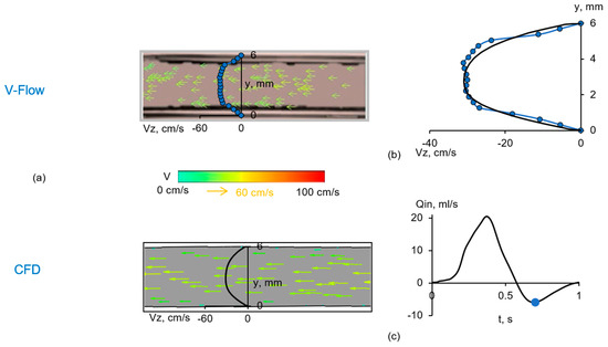 For the section covered by the first window, both the V Flow technique and the simulation visualized the velocity field with nearly straight streamlines parallel to the vessel wall, even for the chosen instant of the reverse flow (Figure 8a and Figure 9a). The measured and calculated profiles shape of the streamwise velocity, Vs, are in reasonable agreement (Figure 8b and Figure 9b, Vs = Vz in this case). The difference between the measured and calculated maximum velocity does not exceed 8%. The standard deviation of the experimental velocity profile points from the calculated one was 9% for the forward flow profile (Figure 8) and 1% for the reverse flow profile (Figure 9), with respect to the peak bulk velocity in the section where the velocity profile was measured.
