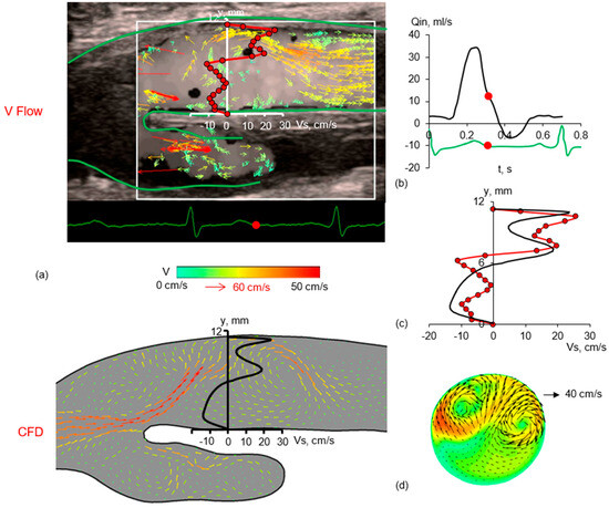 In general, the plots presented in Figure 12 indicate that the results of the clinical V Flow measurements and the CFD simulation are in reasonable agreement. It should be noted here that due to a number of uncertainties, both arising when constructing a personalized computational model and inherent in the V Flow method itself, one can hardly expect complete consistency in the results obtained using the two methods. General limitations of the used methods/approaches can be summarized as follows. The V Flow method has the following limitations: (i) the impossibility of obtaining data for 3D vector flow visualization, (ii) the size of the scanning window is 20 × 27 mm only, (iii) the depth of the scanning window is limited by 50 mm, and (iv) recording time is limited by 3 s. The limitations of the applied numerical simulation technique are (i) neglecting pulsations of the vessel walls, and (ii) the assumption of the quasi-laminar flow regime. The main difficulty when comparing the results obtained with the two methods is attributed to the choice of a longitudinal section of the personalized model with the calculated 2D vector velocity pattern that would be as close as possible to the position of the scanning plane during the clinical study.