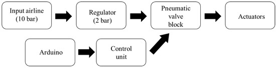 As shown in Figure 1, the disturbance model was connected to a high-pressure air source and then regulated down to the required operating pressure of the actuators of 2 bar. The flaplets were easily controlled via an Arduino board, the different buttons of which could be programmed to operate different flaplet duty cycles by opening and closing the valves.