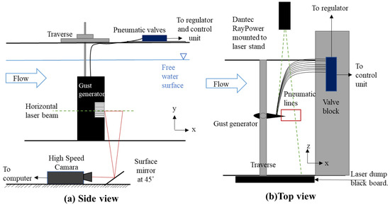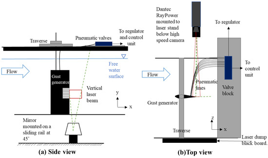 To capture the disturbance generated in detail, two PIV setups were arranged. The first was with the light-sheet oriented in the horizontal plane, crossing the disturbance generator in the middle of the flap row that was to be actuated. The second setup used the light-sheet in the vertical plane, parallel to the suction side and in line with the trailing edge. For both setups, two sets of images were captured—the first at the trailing edge and the second at a half chord (15 cm) further downstream. This was achieved via a traverse to which the gust generator model was attached, while the recording setup remained in its position. A pre-mixed solution of tracer particles (diameter: 50 m) was added to the tunnel and allowed to mix thoroughly for an even seeding. Below, Figure 3 shows the vertical plane setup for PIV measurements, the green dashed lines represent the approximated edges of the laser sheet and the red lines show the approximated field of view to the camera.