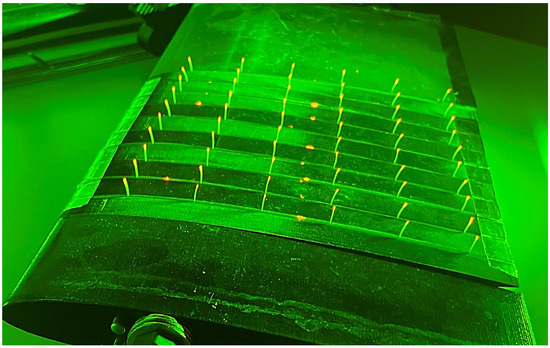 Figure 5 shows the pillars under a green LED light, with the pink tips highly visible. The tips of the pillars were carefully marked with fluorescent dye (MMA-RhB- 113 Frak-Paticles, Dantec Dynamics, 584 nm peak emission, 540 nm peak absorption) to enhance the tip movement and aid in tracking them effectively. In Figure 5, dye spots marked on the model can also be seen; these were to ensure that the model did not move during the tests, and they were used as reference spots.