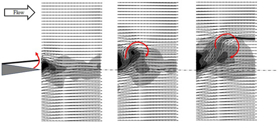 The left-hand counterclockwise rotating red arrow indicates the motion of the flaplets opening, and the following clockwise rotating red arrow indicates the head of the vortex loop, with a region of high velocity on top and lower velocities underneath due to the velocity induction effect. Note that the vortex was convecting downstream with the mean flow; therefore, the streamlines representing the vortex were not closed in circular form but were seen as a strong bending curvature (addition of mean flow + circulation). This corresponded to the flow region representing the core of the starting vortex.
