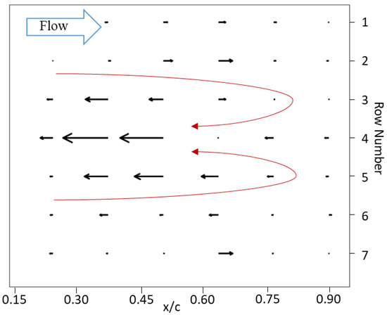 An exemplary result is shown for t* = 0.7 in Figure 11, which was when the disturbance was expected to convect to the middle of the sensory array (for the given period and distance from the gust generator). It can be seen that the disturbance roughly appeared over five pillar rows at a time (rows 2–6, as shown); this correlated well with the affected span seen in Figure 8, where the disturbance also acted over the span of the deployed flaps. In addition, the reconstructed pattern showed some degree of symmetry to the centreline, similarly to what was observed in the characterisation of the disturbance pattern. There was a maximum local reduction in the deflection of the pillars along the centreline row for columns 2 and 3 (in line with the centre of the flaps). A weaker reduction was above and below this row, which was where the pillar tips were nearer to the outer flaplets. Further away from the centreline, there was some flow acceleration, as shown by the positive bending of the pillars. The red lines overlaid on the quiver plot indicated the suggested alignment of the head of the vortex loop and the resulting induced flow pattern underneath, as expected from the PIV images. Overall, the reconstructed pattern matched with what was expected to be a footprint of the horseshoe vortex on the trailing wing. Note that the strength of the induced vortex dissipated over the travel distance between the gust generator and sensing aerofoil due to viscous diffusion. This was why the PIV measurements for characterisation were performed in the same downstream location as where the sensing pillars were placed.