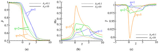 Distributions of the dimensionless pressure (a), Mach number (b), and dimensionless temperature (c) along the symmetry axis () for , , , and . The data for and 10 are shown with the dashed and solid lines, respectively.