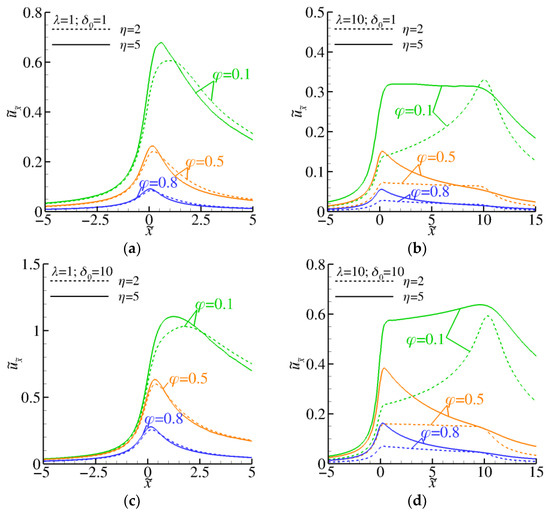 Contours of the dimensionless axial velocity for τ = [1,3.3], δ0 = [1,10], and λ = [5,10]. In each subfigure, the upper part shows the results for τ = 1, and the lower part for τ = 3.3.