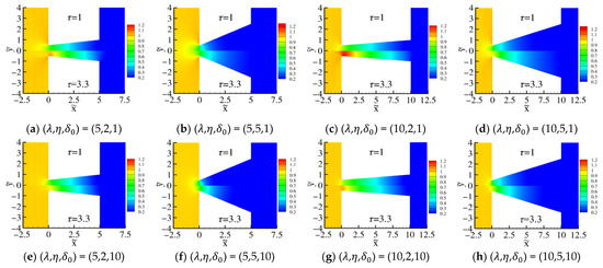 Contours of the dimensionless pressure for τ = [1,3.3], δ0 = [1,10], and λ = [5,10]. In each subfigure, the upper part shows the results for τ = 1, and the lower part for τ = 3.3.